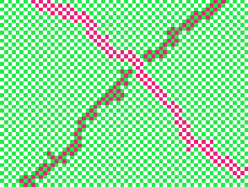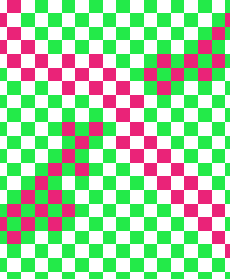 En realidad el dibujo sólo tiene tres colores: el blanco, el verde y el magenta, pero según lo próximos que se encuentren los unos de los otros, creemos ver colores distintos. |